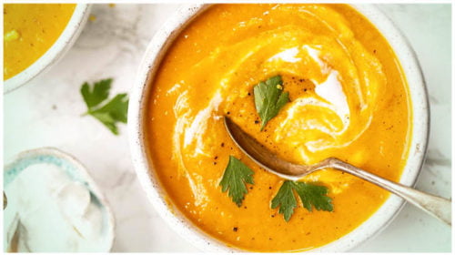 Den Rest schälen, würfeln und zur Suppe geben. Abschmecken und pürieren.