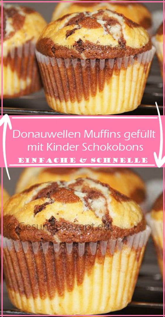 Den hellen Teig in die Förmchen füllen, mit Schokobon bedecken und den dunklen Teig auffüllen. Im Backofen bei 175°C ca. 20 Minuten backen.