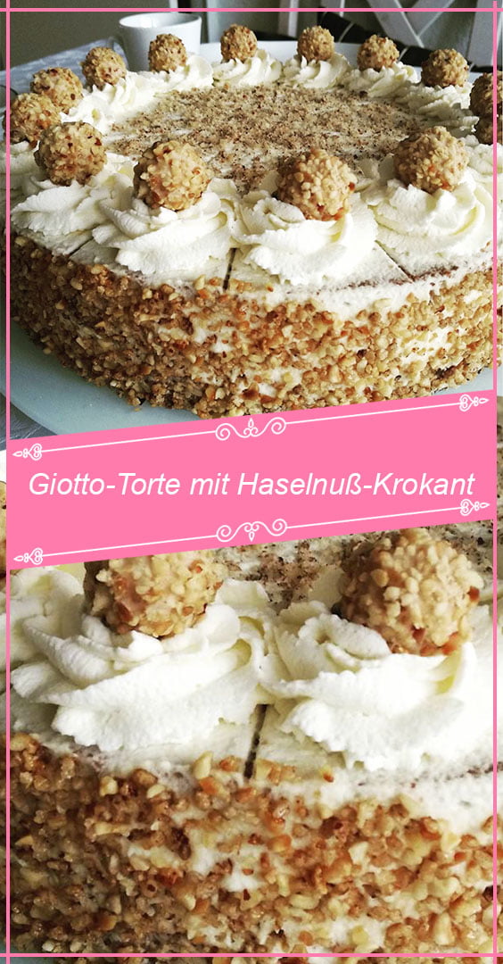 Je nach Wunsch kann man nun den Kuchen verziehren mit Haselnuß-Krokant und extra Sahne + den übriggebliebenen Giottos, die man nochmal in Hälften schneiden kann.