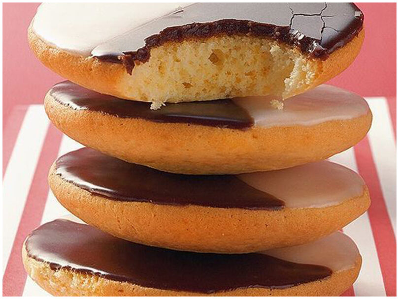 - Dekorieren: Die ausgekühlten Amerikaner mit der hellen Glasur auf der einen und der Schokoladenglasur auf der anderen Hälfte bestreichen. Glasur fest werden lassen.