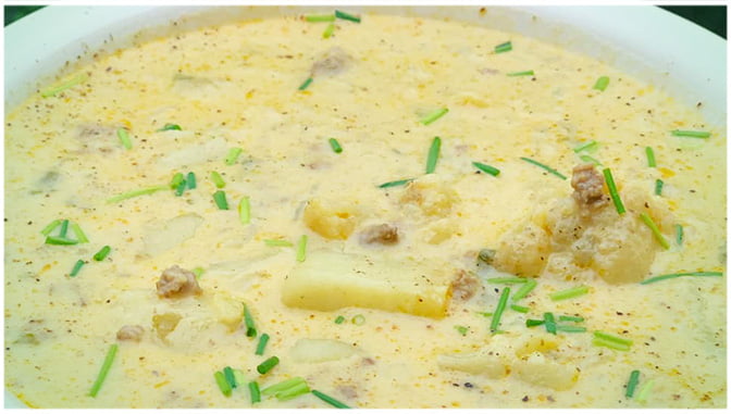 Das Hackfleisch in einem großen Topf in dem heißen Öl kräftig anbraten, die Zwiebeln hinzugeben und kurz mit braten, Chili und Paprikapulver unterrühren. Den Blumenkohl in mundgerechte Stücke zerkleinern und zusammen mit den Kartoffelwürfeln in den Topf geben. Mit so viel Wasser aufgießen, dass die Zutaten fast bedeckt sind. Mit Salz und Pfeffer würzen, bei geschlossenem Deckel etwa 20 Minuten köcheln lassen, bis das Gemüse weich ist. Den Schmelzkäse unterrühren und noch einmal mit Salz und Pfeffer abschmecken.