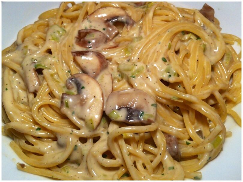 Die Spaghetti auf Teller verteilen und mit der cremigen Champignon-Sauce übergießen. Zum Schluss mit Reibekäse bestreuen.