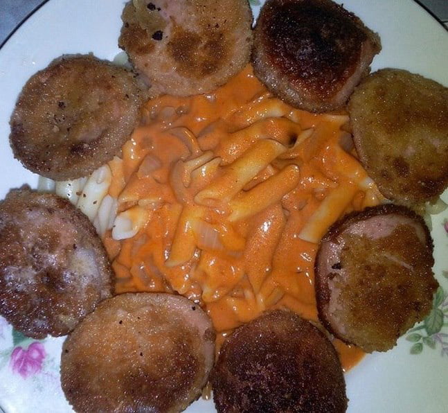 - panierte Fleischwurstscheiben anbraten wie Schnitzel
