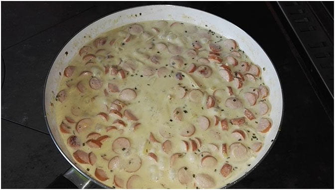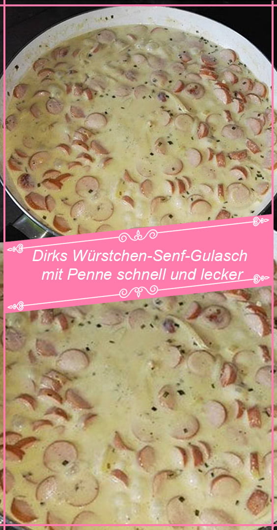 Die Würstchen in Stücke und die Zwiebel in Ringe schneiden. Den Knoblauch hacken. Nun alles für fünf Minuten mit etwas Öl in der Pfanne anbraten, bis die Zwiebeln glasig sind.Währenddessen die Sahne und die Gemüsebrühe mischen und dann die Flüssigkeit in die Pfanne geben. Diese etwas köcheln lassen, den Senf hinzufügen und nochmals ein wenig köcheln lassen. Je nach Geschmack nimmt man etwas mehr oder weniger Senf.Zwischenzeitlich drei TL Speisestärke mit etwas kaltem Wasser (das Wasser muss kalt sein, sonst bilden sich Klümpchen) mischen, bis es komplett flüssig ist. Damit nun das Gulasch binden, bis es die gewünschte Sämigkeit hat. Man kann auch fertigen Saucenbinder nehmen, ich allerdings bevorzuge reine Speisestärke.
