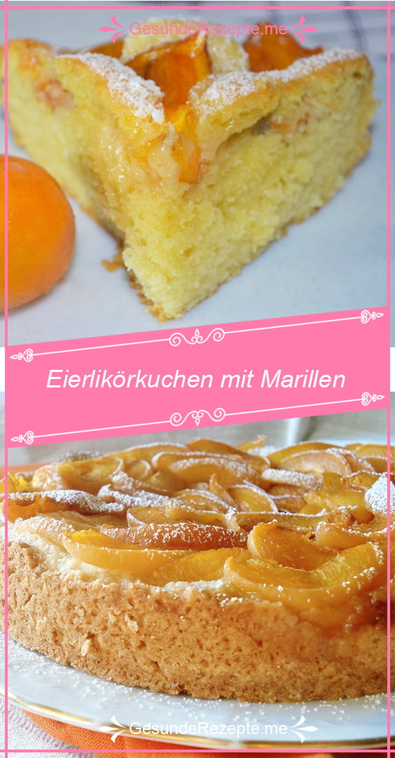 Eine gefettete, bemehlte Form mit Marillen auslegen, Masse drübergießen und den Eierlikörkuchen mit Marillen im Backrohr bei 170 °C ca. 45 Minuten backen.