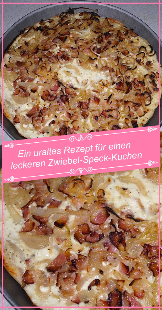 Mit saurer Sahne bestreichen, mit Zwiebeln und Speckwürfeln bestreuen und in den Backofen schieben.