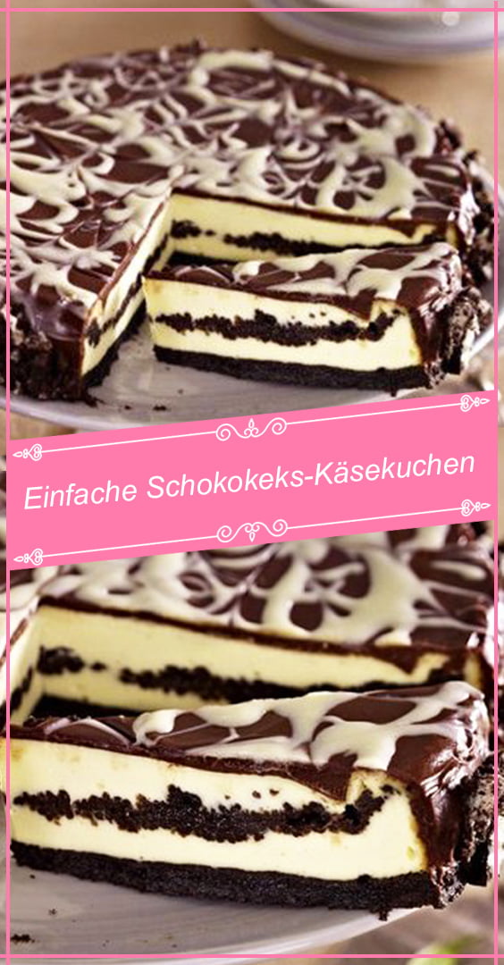 Dunkle Schokolade grob hacken und über einem warmen Wasserbad schmelzen. 70 g Sahne dazugießen und glatt rühren, etwas abkühlen lassen. Mit der weißen Schokolade und 30 g Sahne genauso verfahren. Käsekuchen mit der dunklen Glasur überziehen. Weiße Glasur grob darauf verteilen, mit einem Zahnstocher marmorieren. Rand mit Keksstückchen verzieren und Kuchen ca. 30 Minuten kalt stellen