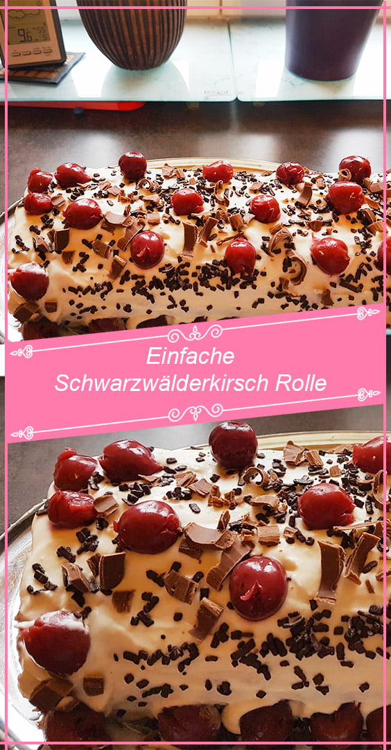 sahne Sahne mit Gelatine steif schlagen Kirschen auf Boden sahne drauf einrollen außen Sahne Kirschen sind schokoraspeln drauf