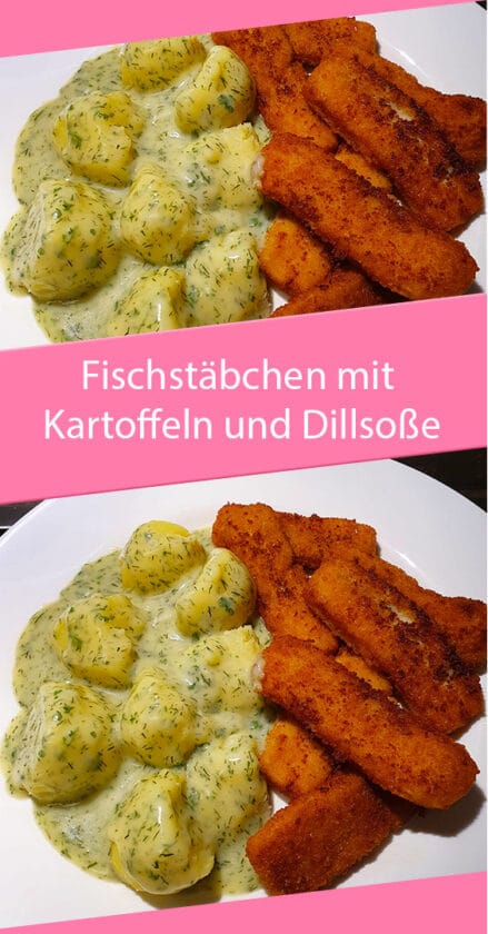 Serviervorschlag: Fischstäbchen mit Kartoffeln und Dillsoße anrichten und genießen!