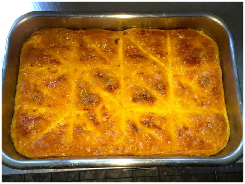 Boden und Wände einer Auflaufform mit Butter bepinseln. 1 Teigblatt auf die Arbeitsfläche legen und mit Butter bepinseln. Ein zweites Blatt darauflegen und ebenfalls mit Butter bestreichen. Auf diese Weise insgesamt 6 Teigblätter aufeinanderstapeln. Den Stapel in die Form heben und andrücken.Darauf achten, dass Boden und Wände vollständig mit Teig bedeckt sind. Die Füllung hineingießen und glatt streichen. Die restlichen Filoblätter ebenfalls einzeln mit Butter bepinseln und aufeinanderstapeln. Den Stapel auf die Füllung legen und den Teig an den Rändern nach unten drücken, damit die Füllung vollständig mit Teig umschlossen ist. Mit einem scharfen Messer vorsichtig Stücke vorzeichnen (muss aber nicht sein). Im Backofen ca. 20 – 25 Minuten backen. Herausnehmen und einige Minuten ruhen lassen, dann mit dem Sirup übergießen. Eine Stunde ruhen lassen, damit der Sirup einzieht. Nicht im Kühlschrank aufbewahren.