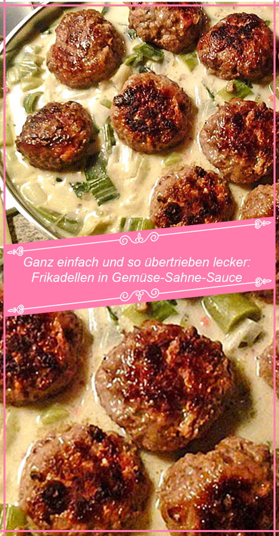 Erbsen-Möhren-Gemüse abtropfen lassen und ins Bratfett geben, etwas darin dünsten lassen. Mit der Sahne ablöschen und etwas köcheln lassen. Mit Gemüsebrühe abschmecken und mit (dunklem) Saucenbinder andicken. Frikadellen auf die Sauce legen und wieder heiß werden lassen.