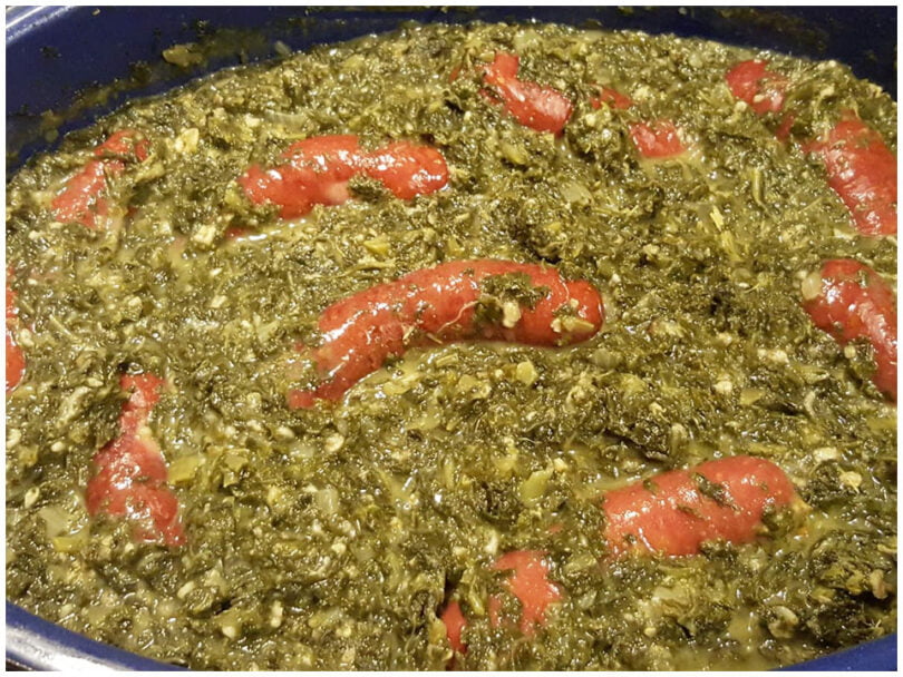 Die Pelle von 2-3 Pinkelwürsten abziehen, Würste klein schneiden und in den Grünkohl rühren. Speck und 2-3 angepiekste Mettenden hinzufügen. Den Topf wieder verschließen und den Grünkohl bei geringer Hitze weitere 2 Stunden leicht köcheln lassen, dabei gelegentlich umrühren.