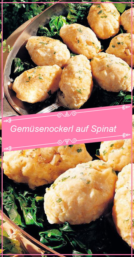 Spinat auf Tellern anrichten, Nockerln aus dem Kochfond heben, gut abtropfen lassen und auf den Spinat setzen. Restliche Butter erhitzen bis sie braun ist und vor dem Servieren über die Nockerln gießen.