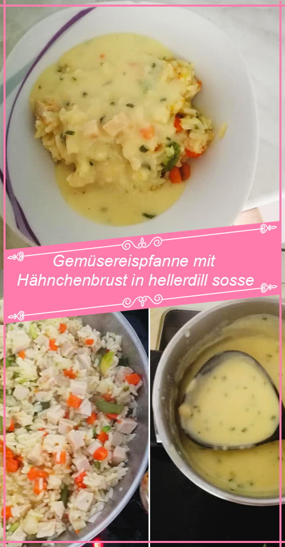 In der Zeit Hähnchenbrust klein schneiden und in ein Teelöffel Margarine braten dann das suppengemüse dazu ich habe ungefähr 2 Hände voll hinzugefügt bissen mit braten dann den fertigen reis unterrühren und ca 20min mit 100ml Brühe köcheln gelassen in der Zeit habe ich die sosse dann gemacht mit 1esslöffel Margarine in Topf schmelzen lassen dan 2 Esslöffel Mehl rein gerührt mit Brühe und Milch abgelöscht dill dazu und 10min köcheln lassen unter mehrmaliges umrühren dann auf teller servieren und guten Appetit