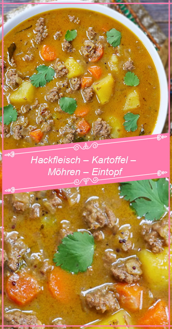 Das Hackfleisch und die in Würfel geschnittenen Zwiebeln leicht anbraten. Die Möhren und die Kartoffeln schälen, in kleine Würfel schneiden und dazugeben. Mit der Brühe aufgießen und 45 Minuten köcheln lassen.