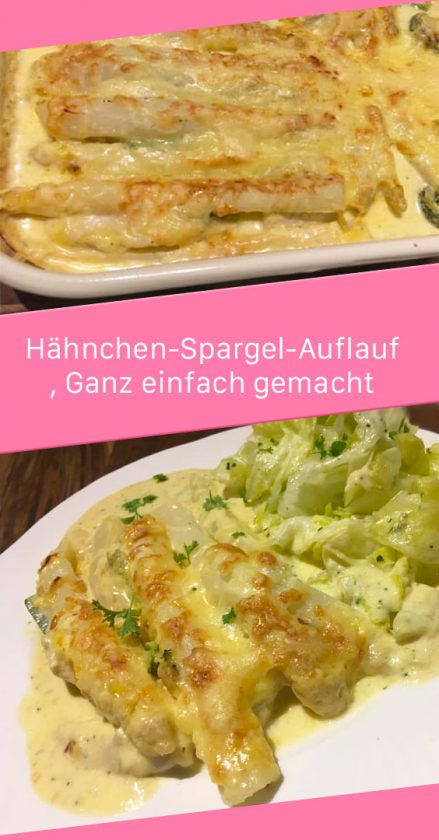 Darüber das Hähnchen-Filet in ca. 1cm dicken Scheiben auslegen. Dann die Sauce darüber verteilen. Dann der Länge nach halbierte Spargelstangen darüber auslegen und zum Schluß mit dem geriebenen Emmentaler bedecken!