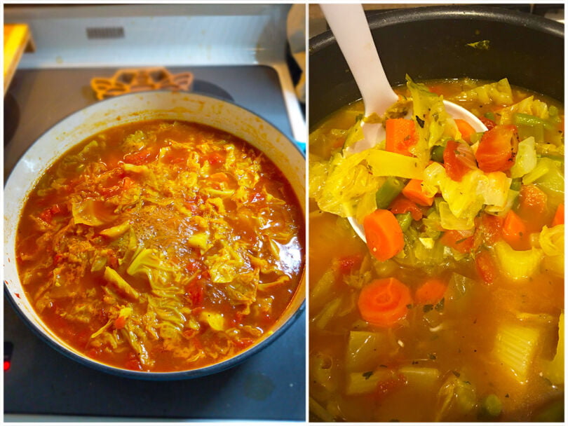 Sie können die Mahlzeit gerne mit Bohnen, Kartoffeln oder Ditalini-Nudeln aufwerten. Wenn Sie Nudeln hinzufügen, halten Sie sie getrennt, bis sie serviert werden, damit sie nicht in der Suppe aufquellen. Das bringt wirklich viele Kalorien mit sich, deshalb habe ich darauf verzichtet.