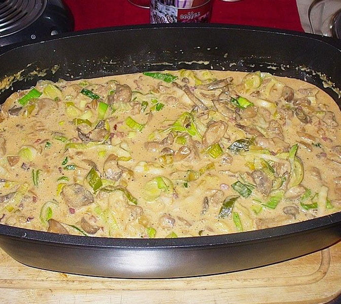 Das Fleisch klein schneiden und mit der Würzmischung vermengen und in einen geölten Bräter geben. Den Käse darüber legen. Dann den klein geschnittenen Porree darüber verteilen, hierüber die Lage Champignons. Die Zwiebeln werden mit dem in kleine Würfel geschnittenen Bauchspeck gedünstet. Dieses muss erkalten.
