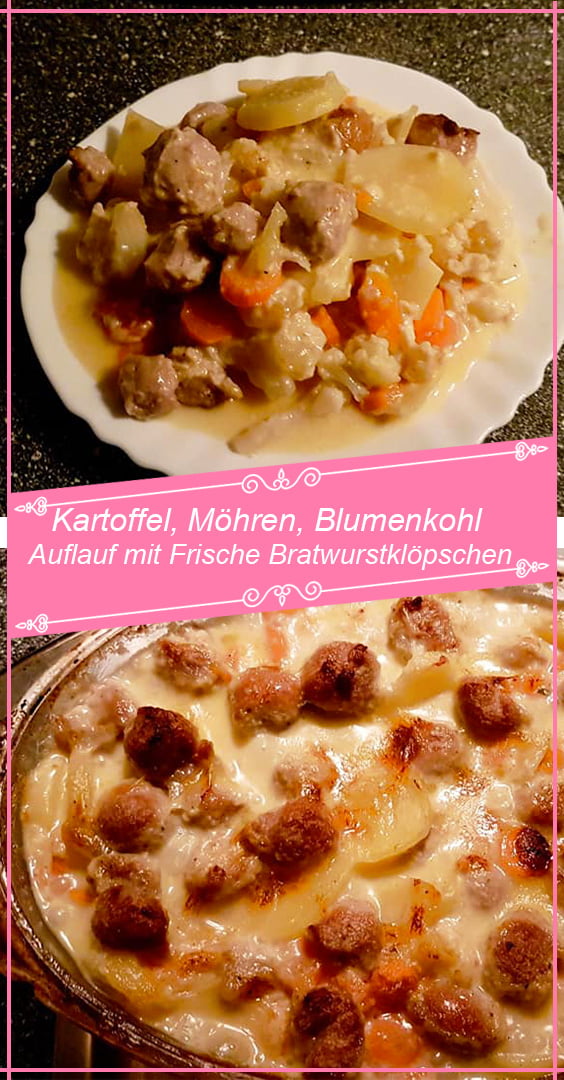 5 Kartoffeln und 5 Möhren schälen und in Scheiben schneiden und mit in die Soße geben. 10 -15 auf kleiner Stufe köcheln. 3 Scheiben Käse nach wahl in mit in die Soße geben und schmelzen lassen. Blumenkohl (TK Waare) in die Auflaufform geben und die Kartoffel, Möhren mit Soße drüber geben. 3 frische Bratwürste aus dem Darm drücken in kleine Klöpschen oben auf den Auflauf drauf .
