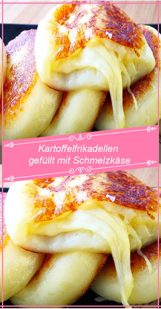 Eier, Kartoffelstärke, Zwiebel- und Knoblauchwürfel zu den Kartoffeln geben, gut verkneten, mit Salz, Pfeffer und Thymian würzen. Aus der Masse acht Frikadellen formen, in die Mitte jeweils ein Stück Käse drücken, mit der Kartoffelmasse gut umhüllen. Öl in einer Pfanne erhitzen, Kartoffelfrikadellen von beiden Seiten goldbraun braten.