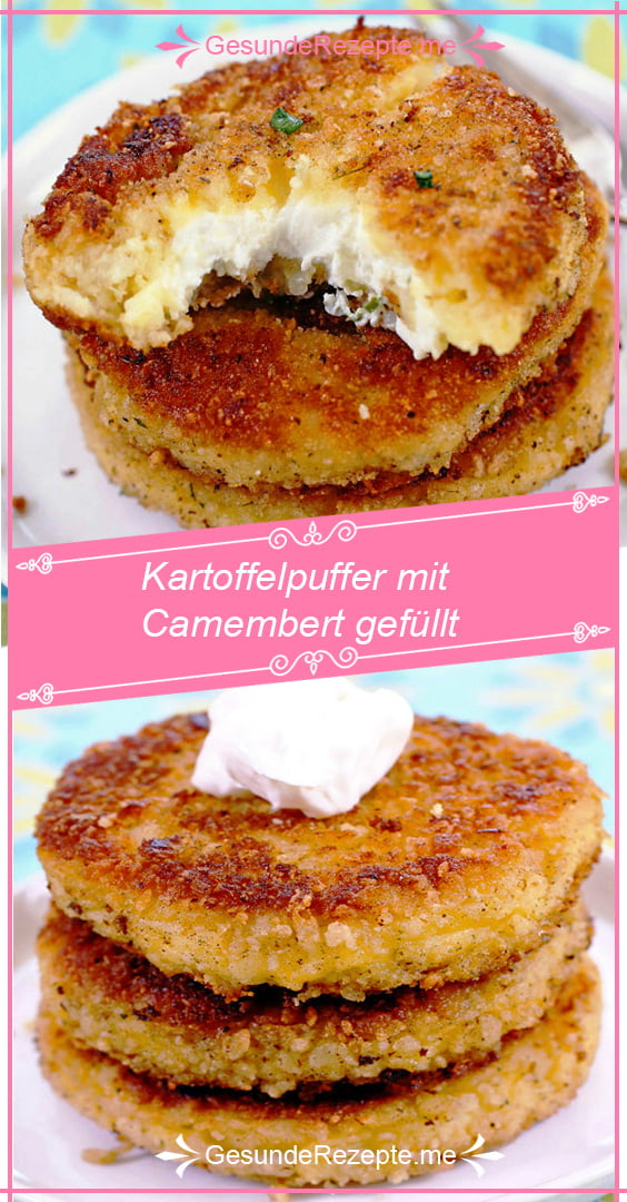 Camembert in 8 Stücke teilen (längs halbieren und dann vierteln). Öl in der Pfanne erhitzen. Vier Kartoffelmasse-Häufchen darauf geben, jeweils 1 Stück Camembert darauf legen und wieder mit der Kartoffelmasse zudecken.