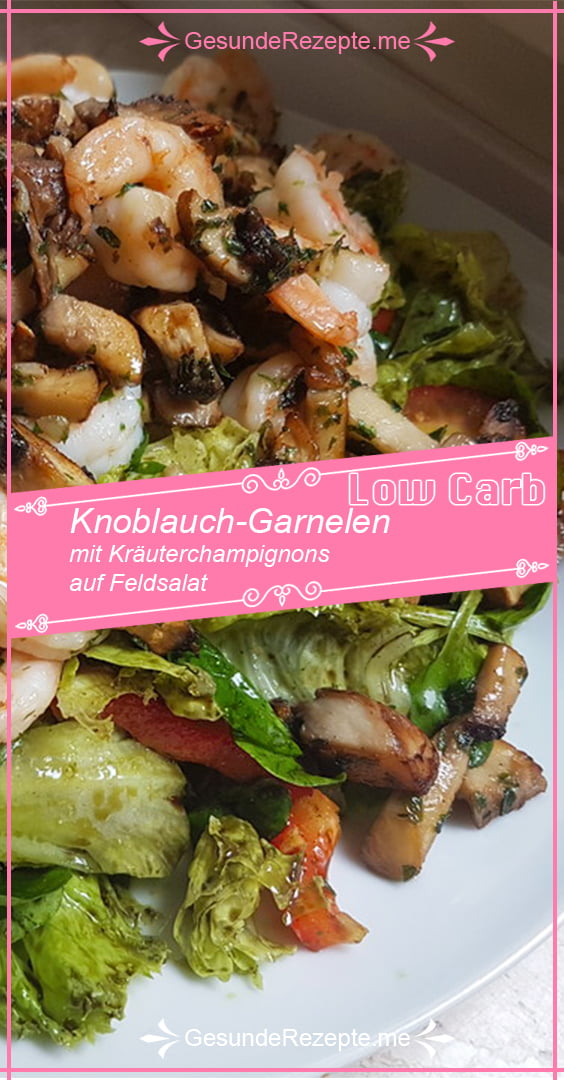 Das Knoblauchöl in einer Pfanne erhitzen, die aufgetauten Garnelen (oder eben frische) in die Pfanne geben und sofort salzen. Währenddessen die Champignons vierteln. Nach 2 Minuten die Garnelen wenden und weitere 2 Minuten anbraten. Danach die heißen Garnelen auf die zwei Teller verteilen. In dieselbe Pfanne die Champignons geben, damit sie den Geschmack gut annehmen können. Salzen, pfeffern und mit der Petersilie überstreuen. Nur 2 Minuten unter ständigem Rühren anbraten, danach auch die Pilze auf dem Salat verteilen.