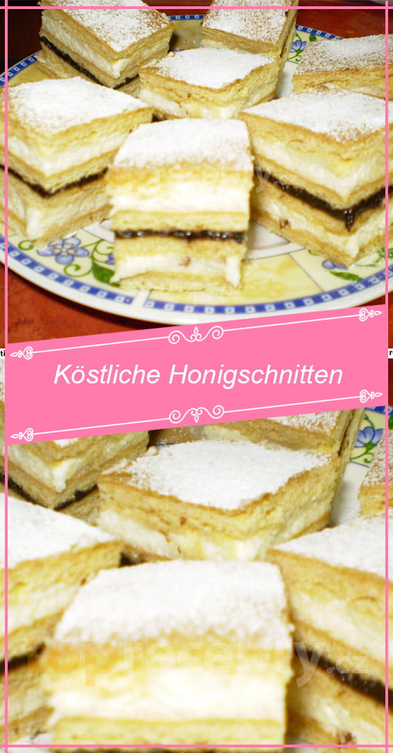 Mehl, Margarine, Puderzucker, Eigelb, Eier, Honig und Natron in einer Schüssel vermengen und zu einen glattem Teig verkneten. Den Teig halbieren und jeweils zu einer Teigplatte in Blech-Größe ausrollen (das Blech einfetten und mit Mehl bestäuben) und bei 180 °C ca. 8 Minuten backen. Danach den Teig mit einem Messer vom Blech vorsichtig abmachen.