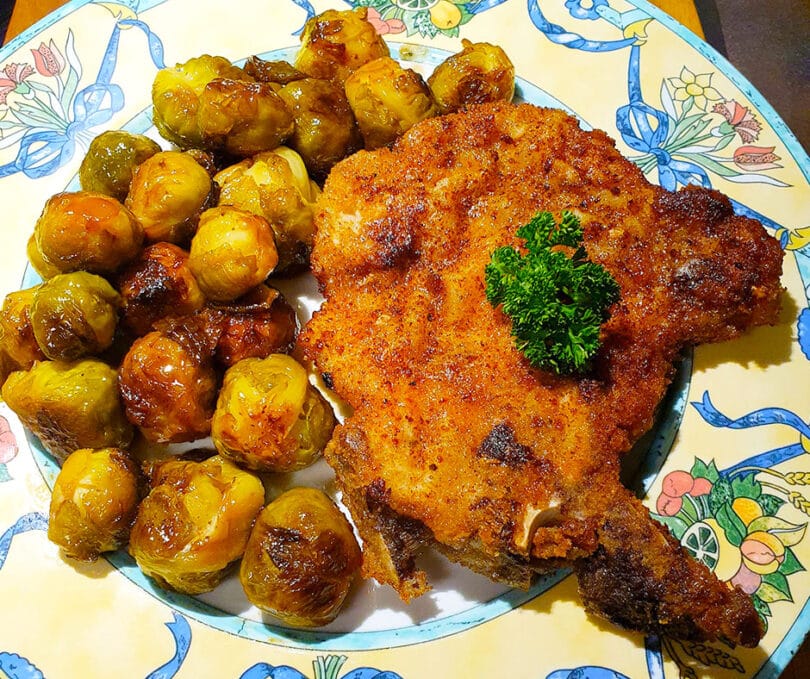 Die knusprig gebackenen Koteletts zusammen mit dem geschmorten Rosenkohl anrichten und servieren.