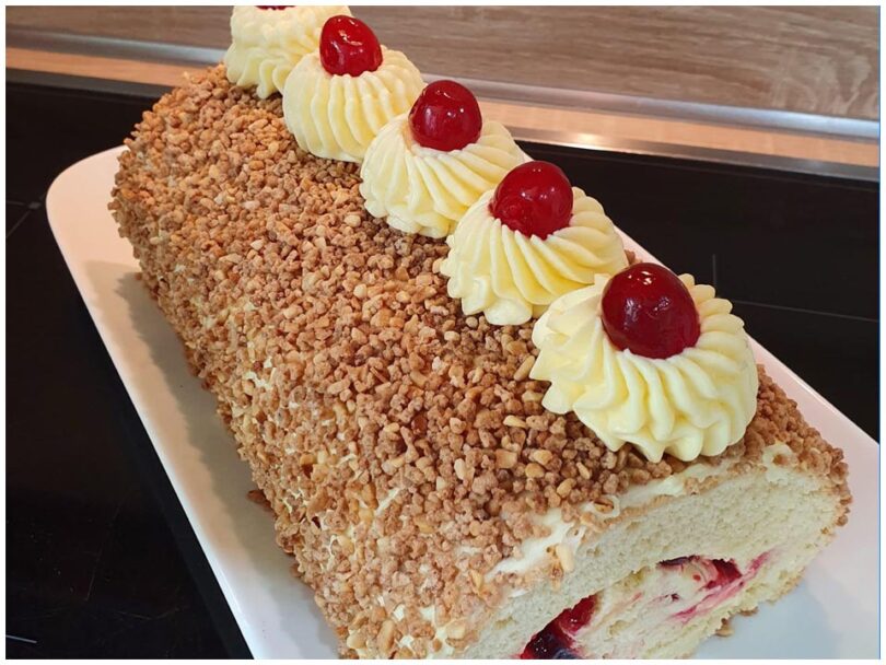 Rolle außen mit restlicher Buttercreme bestreichen und komplett mit Krokant bestreuen. Leicht andrücken. Buttercreme in einen Spritzbeutel füllen und auf der Oberseite Tupfer aufspritzen. Mit Belegkirschen dekorieren.