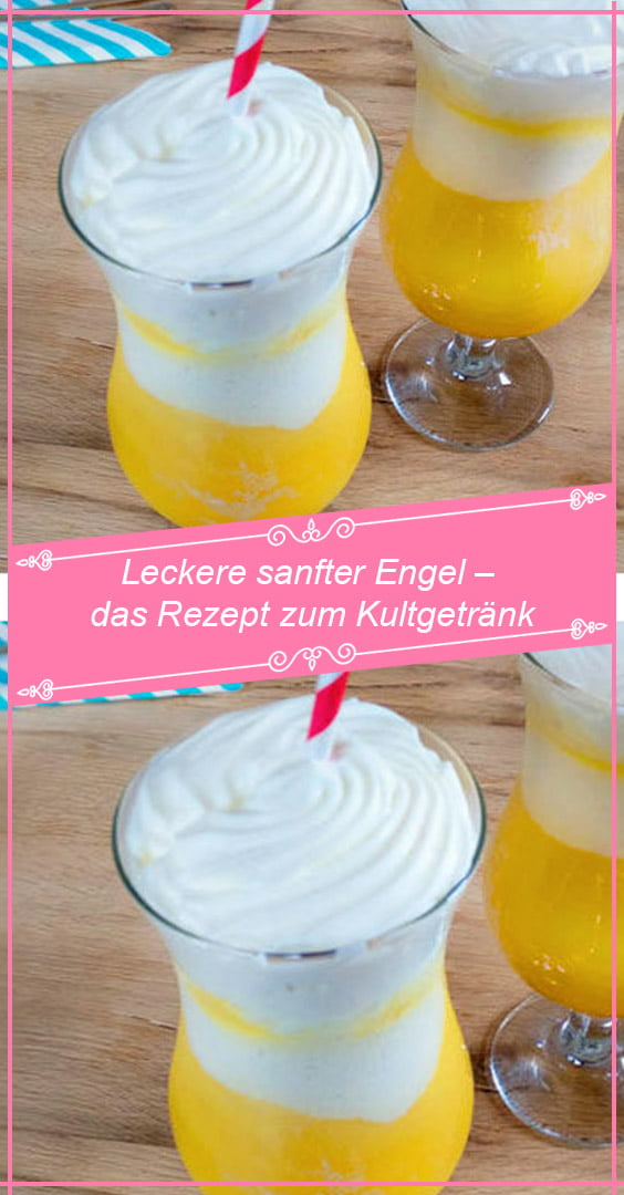 Gebe je 2 Kugeln Vanilleeis in große Gläser und fülle sie anschließend mit Orangensaft auf. Ein besonders großer Genuss ist der Sanfte Engel mit Sahnehaube. Dafür Sahne mit etwas Vanillezucker steif schlagen und auf die Gläser verteilen. Je nach Geschmack bunt dekorieren.
