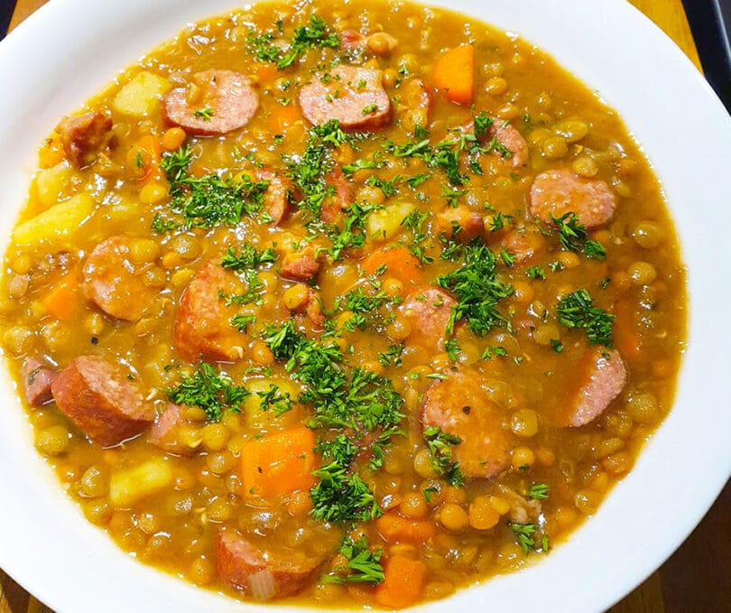 Zehn Minuten vor Ende der Garzeit die Mettenden in Scheiben schneiden und in den Eintopf geben.