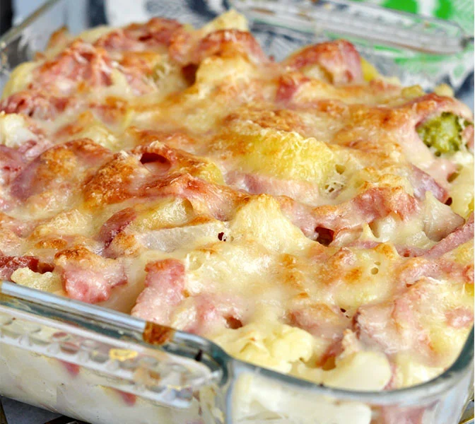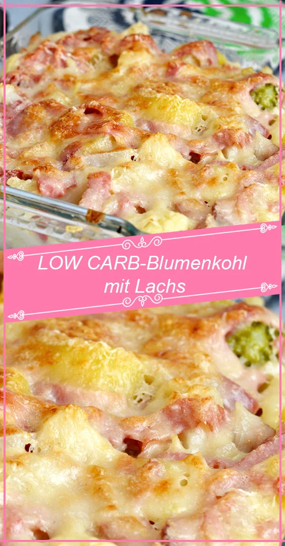 Blumenkohl in eine Auflaufform etwas geölte setzen! Lachs würfeln und mit 1 EL Zitronensaft marinieren. Auf dem Blumenkohl verteilen.