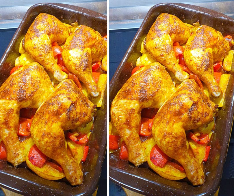Kartoffeln, Zwiebeln und Paprikastücke in eine ofenfeste Form geben und die marinierten Hähnchenschenkel darauf platzieren.