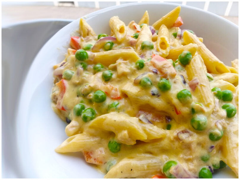 Selbstgemachtes Penne Rigate mit Thunfisch und Erbsen in cremiger Hollandaise-Soße: Köstliches One-Pot-Gericht!