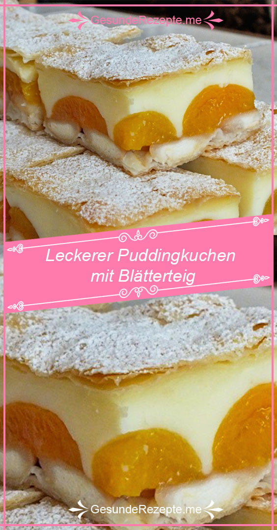 Milch, Zucker und Puddingpulver zu einem dicken Pudding aufkochen. Den warmen Pudding auf den Aprikosen verteilen. Mit der zweiten Teigplatte zudecken. Den Kuchen in den vorgeheizten Backofen schieben.