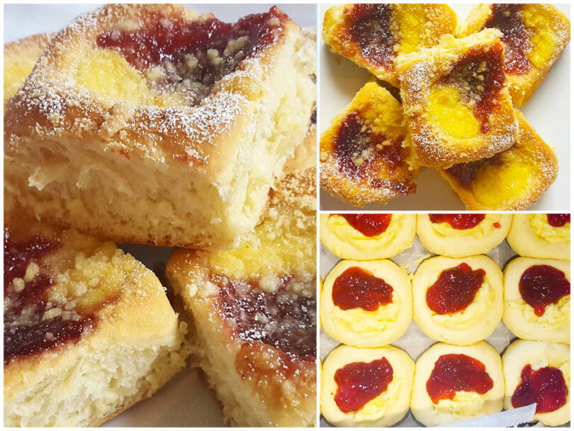 Dann aus dem Teig 12 gleichgroße Kugeln formen. In eine 32 x 24 Backform legen. Nochmal 15 min ruhen lassen. Nun mulden in den Teig drücken und 1 Esslöffel Pudding und 1 Teelöffel Erdbeermarmelade hineingeben. Noch mal 20 min gehen lassen. Nun die Streusel gleichmäßig aufstreuen und im vorgeheizten Backofen bei 180° ( Ober und Unterhitze) ca 35 bis 45 min goldbraun backen. Evtl abdecken.