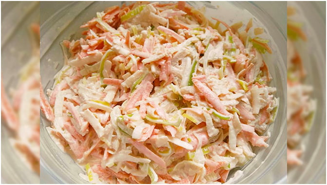 Lauch in Halbmonde schneiden, mit Salz und Öl würzen, und kurz stehen lassen, bis der Lauch weicher wird, dann Möhren und Äpfeln schälen, raspeln und zum Lauch geben, …Mayo mit Sahne und Zucker zusammen mischen, über den Salat gießen , zusammen mischen., Im Kühlschrank aufbewahren ,,,