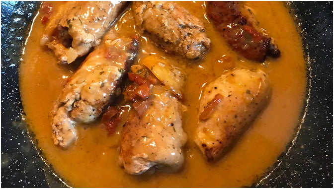 ein Stück Mozzarella, paar Streifen getrocknete Tomaten auf das Fleisch legen und zusammenrollen…. im Öl von den Tomaten anbraten, dann in ein Feuerfestes Gefäß geben, und bedeckt im Backofen braten ( 20 – 30 min. 200° )