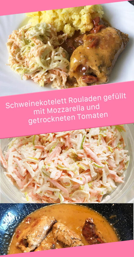 Schweinekotelett Rouladen gefüllt mit Mozzarella und getrockneten Tomaten,…. Porree, Möhren, Äpfel Salat, und gestampfte Kartoffeln…