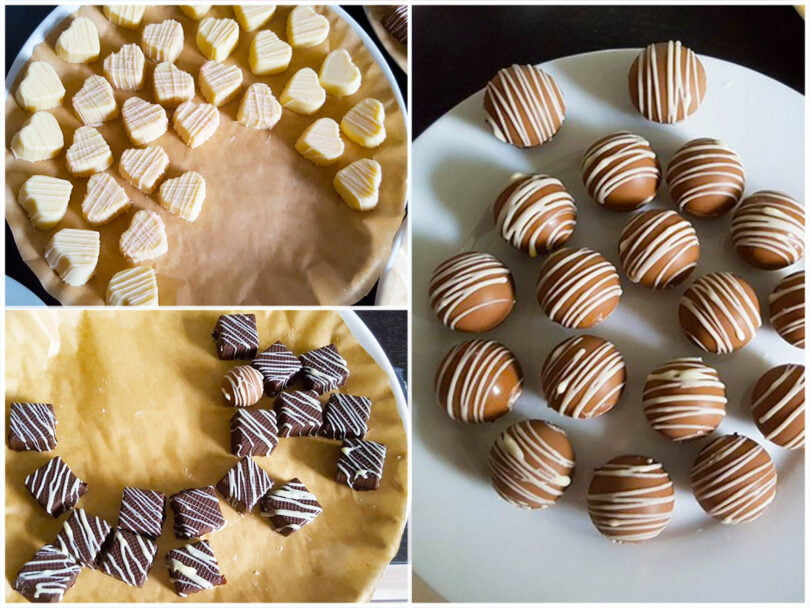 Schmelze etwas Kuvertüre zum Verschließen – aber lass sie kurz abkühlen, sonst verwandeln sich deine Hohlkörper in Schokoladen-Poesie. Dasselbe gilt für die Verzierung: Flüssige Schokolade in einen Frischhaltebeutel gießen, ein kleines Stück abschneiden und dann entsteht das Muster, das deine Praliné zum Star macht.