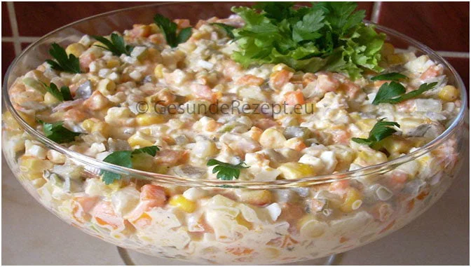 Alle Zutaten in eine Schüssel geben, 2 Spritzer Tabasco und Salatcreme (oder – nach Geschmack auch Mayonnaise) unterheben und den Salat abgedeckt möglichst über Nacht durchziehen lassen.