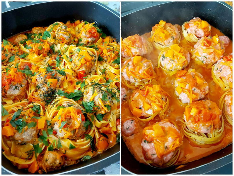 Tagliatelle-Nester mit Hackbällchen und Gemüse-Soße – Ein Fest für die Sinne!