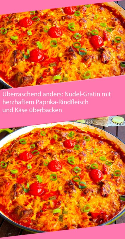 Eine große Auflaufform mit Nudeln füllen und die Fleischsauce darüber verteilen. Mit geriebenem Käse bestreuen.