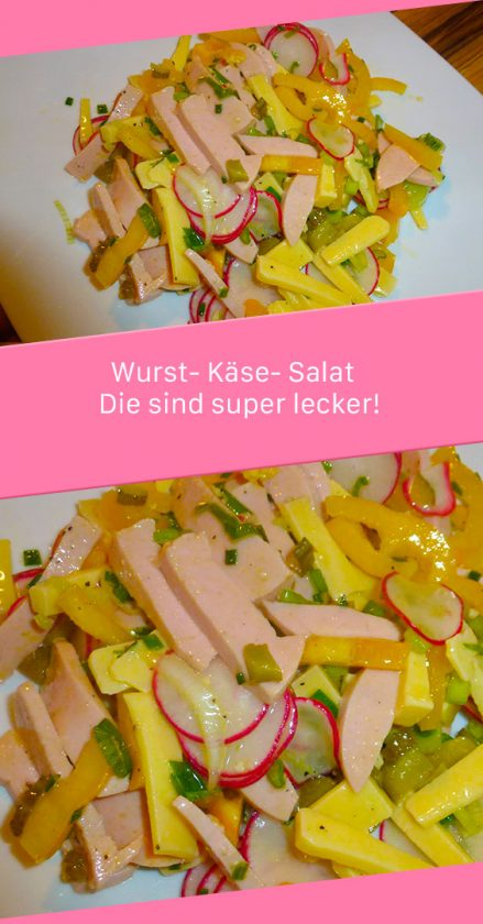 Wurst- Käse- Salat für 4 Personen 400 g Geflügelfleischwurst in Streifen schneiden, 1 Bund Frühlingszwiebeln in Ringe schneiden,1 Bund Radieschen in Scheiben schneiden,3 Gewürzgurken in Würfel schneiden und 250 g Gouda-Käse in Stifte schneiden und alles vermengen.